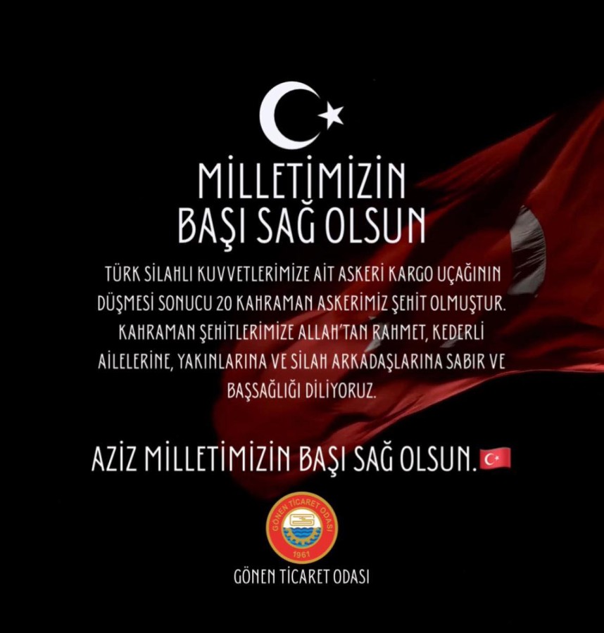 Türk Silahlı Kuvvetlerimize ait askeri kargo uçağının düşmesi sonucu 20 kahraman askerimiz şehit olmuştur.