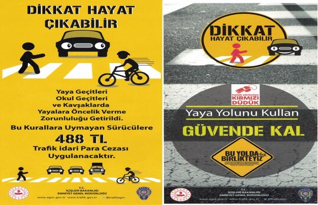 2918 sayılı Karayolları Trafik Kanununun 74'üncü maddesinde 26 Ekim 2018 tarihinde yapılan değişiklikle; "Sürücüler, görevli bir kişi veya ışıklı trafik işareti bulunmayan ancak trafik işareti veya levhalarıyla belirlenmiş kavşak giriş ve çıkışları ile yaya ve okul geçitlerine yaklaşırken yavaşlamak, varsa buralardan geçen veya geçmek üzere bulunan yayalara durarak ilk geçiş hakkını vermek zorundadırlar" hükmü getirildiği, anılan yasal düzenlemeye dikkat etmenizi rica ederiz.